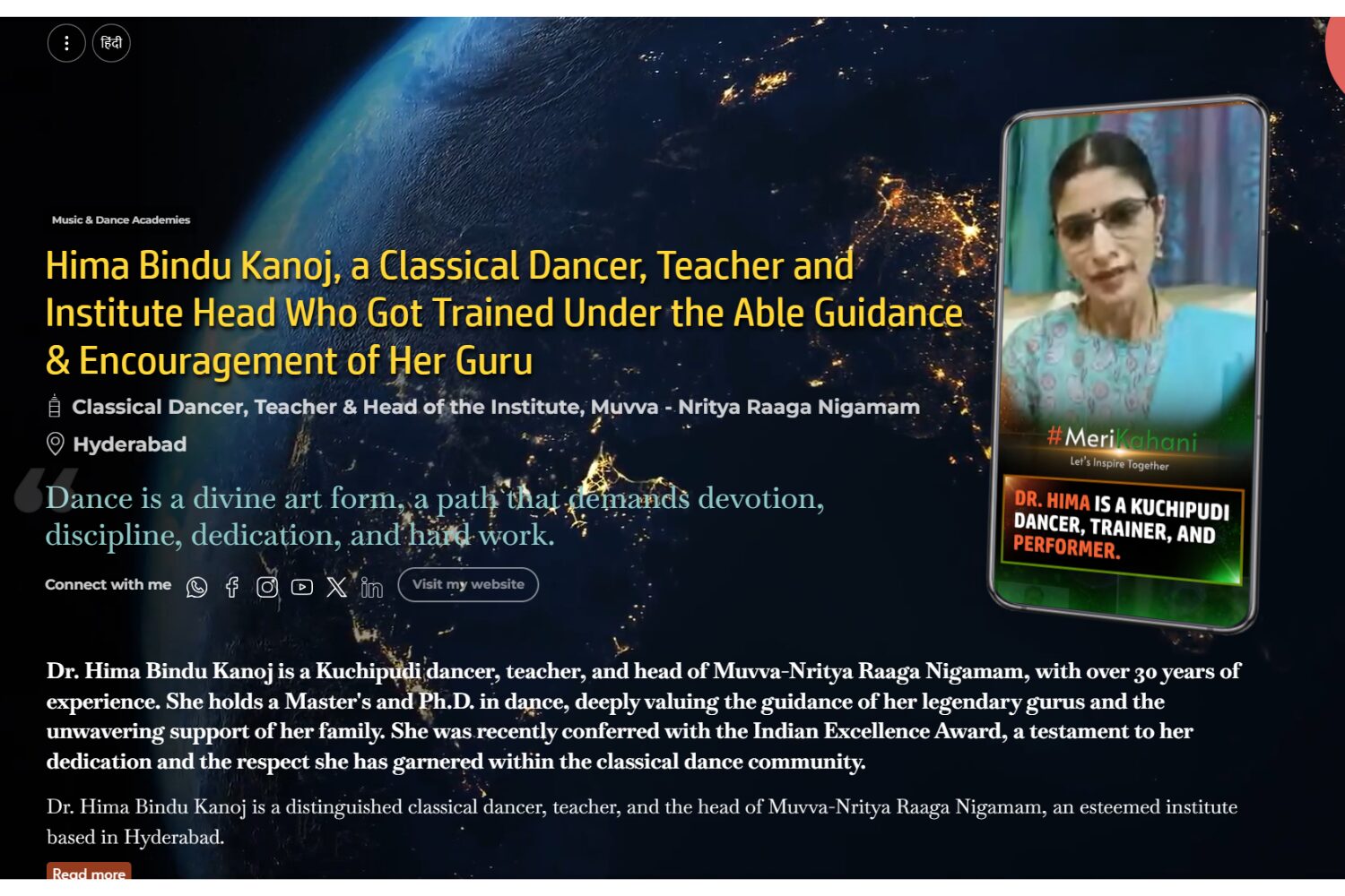 Dr. Hima Bindu Kanoj is a renowned Kuchipudi dancer, researcher, and cultural educator. A graded Doordarshan artist and recipient of the India Excellence Award, she has performed globally and contributed extensively to dance research and heritage documentation. She leads Muvva Nritya Raaga Nigamam and is a core team member of Indian.Temples.