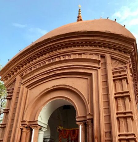 Dolmancha – The terracotta brick structure Dholmancha is made of burnt bricks and has a typical red or earthy hue. It has many different motifs attributed to the Vaishnava sect, carved throughout the temple premise. The Dolmancha is built on the structural principle of Char-chala or four-roofed architectural style.