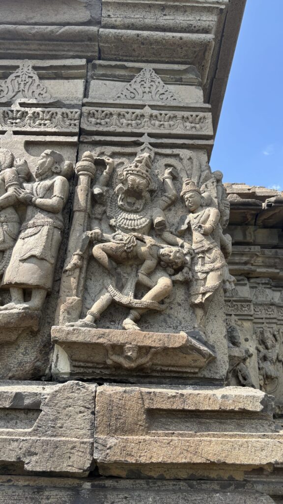 - The Eyes and Mane: Hoysala Narasimhas feature protruding, bulbous eyes (to signify rage) and a mane depicted as stylized ringlets or flames, set against an ornate Prabhavali (arch) carved with unmatched precision.