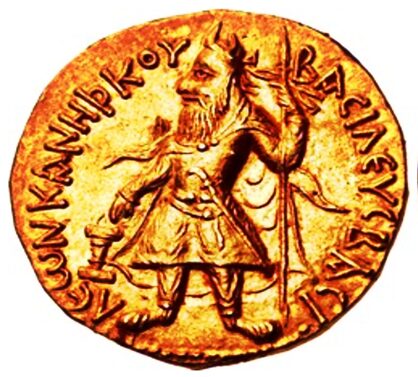 Figure 2: Standard obverse of BODO-type gold-coins, featuring Kaṇiṣka I emitting flames from his shoulders (Courtesy- CNG Coins Triton XXI, Lot 576).