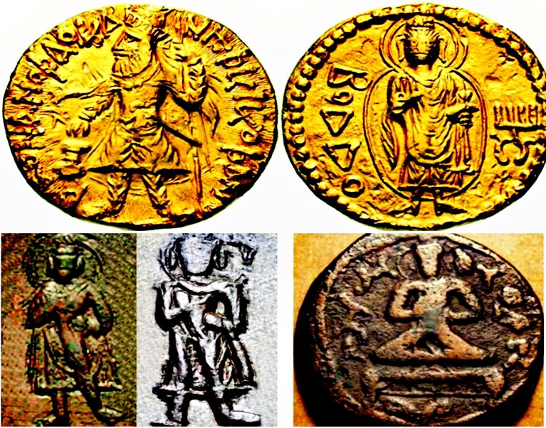 Figure 3: Anti-clockwise- The Buddha Image on Kuṣāṇa gold/copper coins, BODO-type gold-coins (Courtesy- CNG Coins Triton XII, Lot 428); Śākyamuni Buddha on copper coins of Kaṇiṣka (Source- Wikimedia Commons, Creative License SA 3.0); Maitreya Buddha on Kaṇiṣka copper coins (Courtesy- Pankaj Tandon © Coin India Gallery).