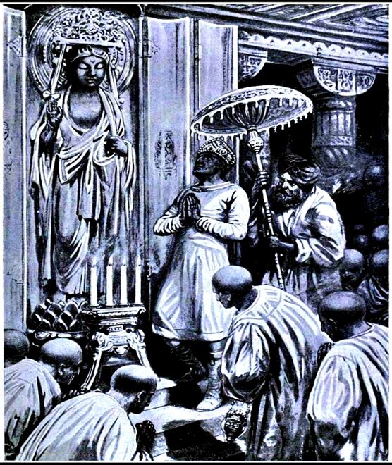 Figure 5: Re-imagined scene of the 4th Buddhist Council, with Kaṇiṣka venerating Buddha; oil canvass by Ambrose Dudley (Courtesy- Wikimedia Commons, Creative Attributive License CC-SA-BY-4.0).